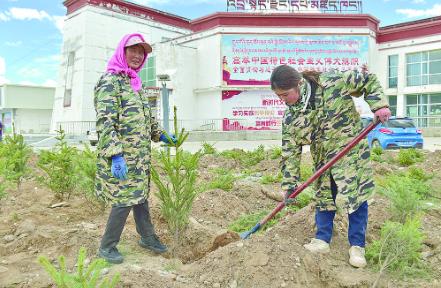 治多县城加吉博洛镇,绿化工人在栽种树苗。祁宗珠/摄